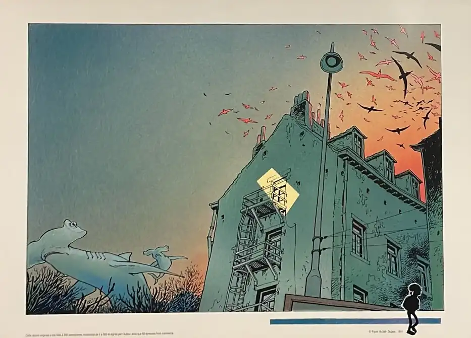 Cette affiche Broussaille Frank Pé intitulée Baleines Publiques met en avant tout le charme graphique de l’univers créé par l’artiste. En effet, Frank Pé développe depuis des années une approche sensible et poétique de la bande dessinée franco-belge. Grâce à son trait expressif, ses compositions dégagent une atmosphère unique, à la fois douce, contemplative et légèrement onirique.