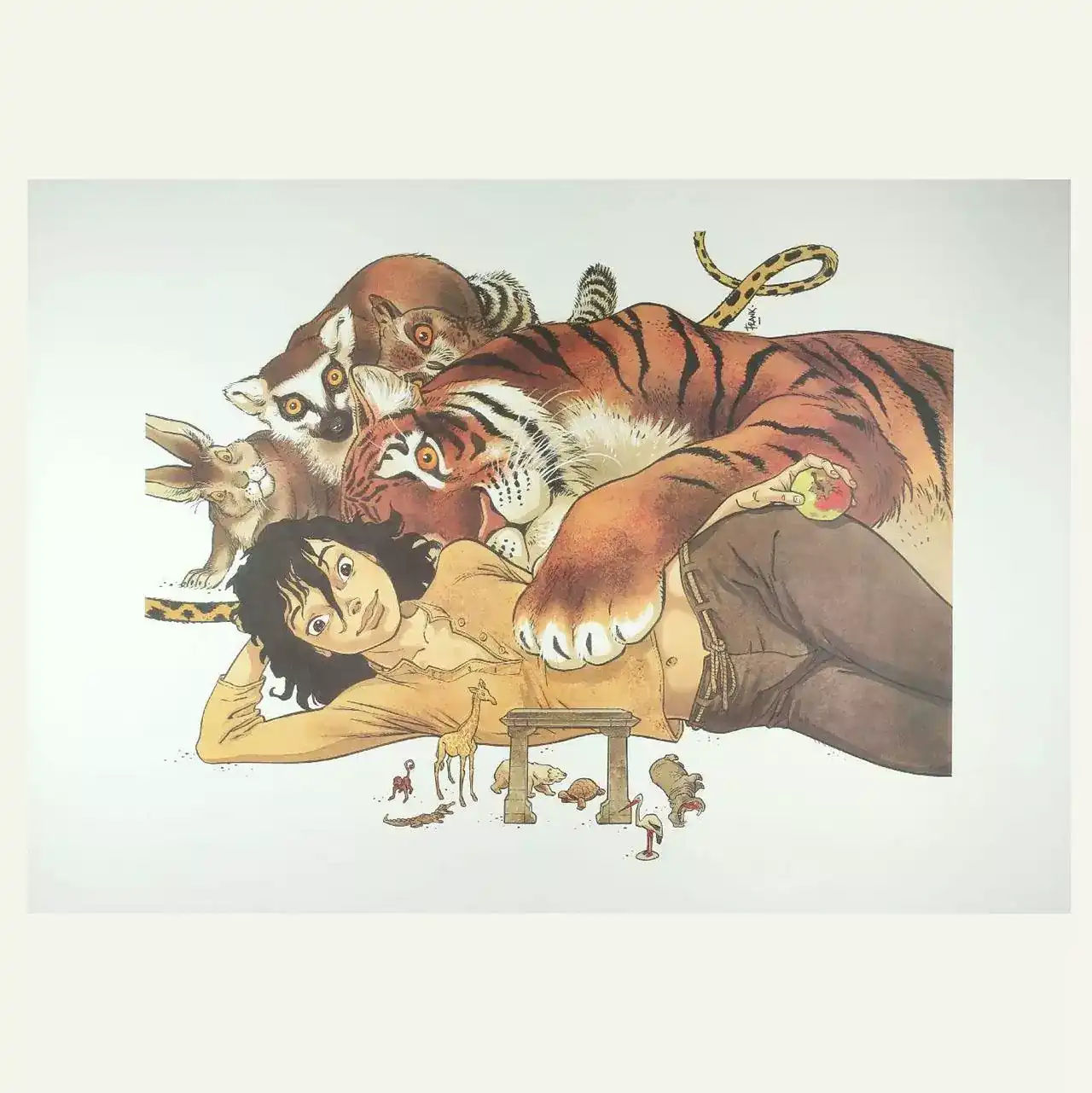 L’Affiche Zoo Frank Pé intitulée Jouets propose une scène douce et chaleureuse inspirée de l’univers de la série Zoo. En effet, Frank Pé y développe toute sa sensibilité en mettant en avant la poésie du quotidien. Grâce à son trait expressif et à son sens du mouvement, il transforme un moment simple en une image pleine d’émotion.