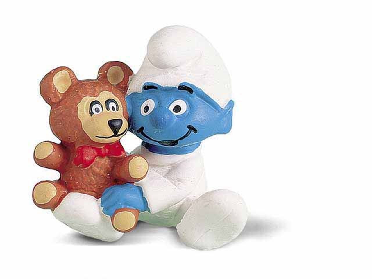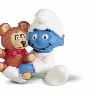 Cette figurine de l’univers des Schtroumpfs représente Bébé schtroumpf avec son nounours. Bébé Schtroumpf fait sauter son grand ourson en peluche sur ses genoux.