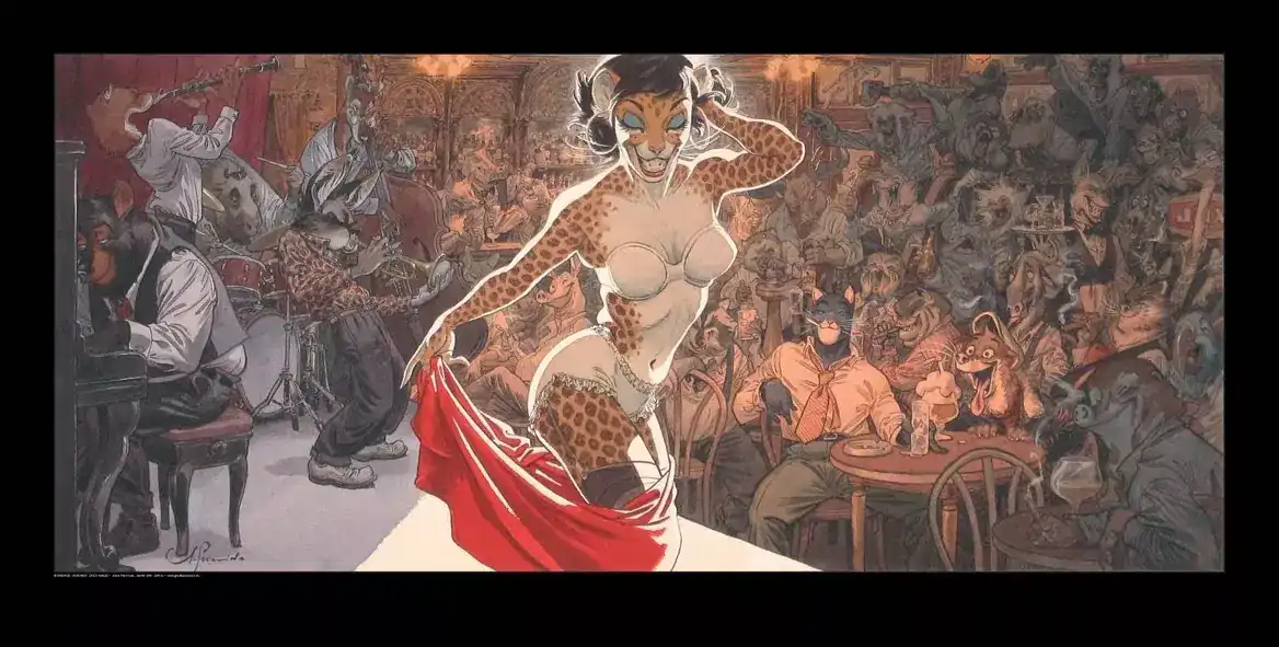 Honnêtement, cette affiche est l’une des plus chaleureuses et musicales de l’univers Blacksad. D’abord, parce que le jazz y est omniprésent. Ensuite, parce que le dessin de Guarnido y est particulièrement atmosphérique. De plus, elle apporte une touche nocturne et élégante à une collection. Enfin, si tu recherches une affiche Blacksad au rythme du jazz et du polar, Jazz’n fun’s club est un excellent choix.