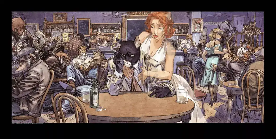 Honnêtement, cette affiche est l’une des plus sensibles de l’univers Blacksad. D’abord, parce qu’elle met l’accent sur l’intériorité du personnage. Ensuite, parce que le dessin de Guarnido y est particulièrement subtil. De plus, elle apporte une ambiance feutrée et mélancolique à une collection. Enfin, si tu recherches une affiche Blacksad élégante et émotionnelle, John’s Blues est un excellent choix.