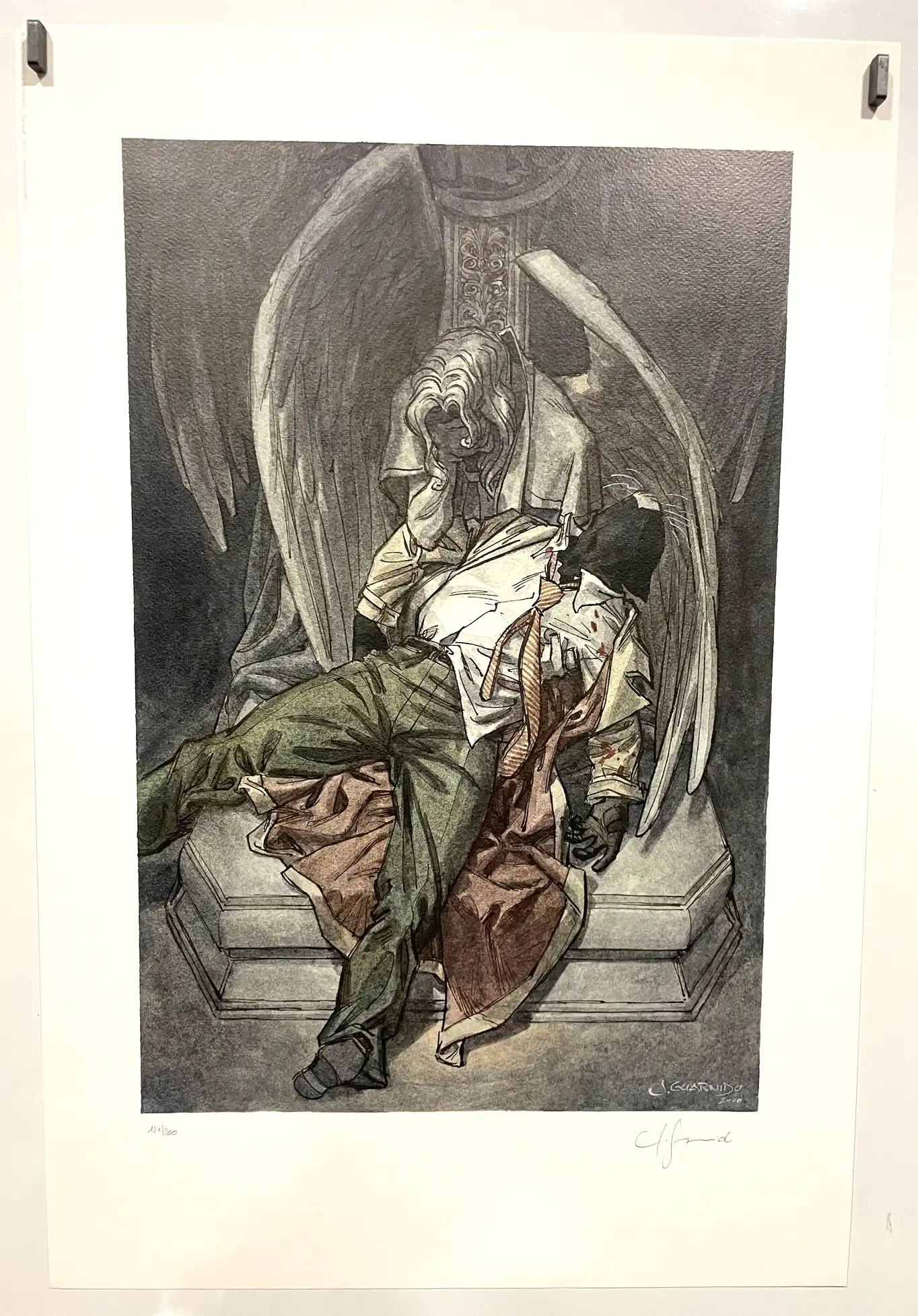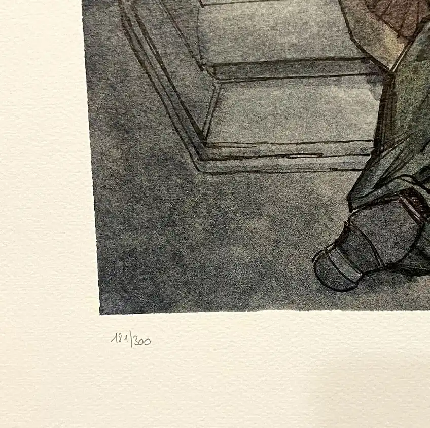 En effet, l’univers de Blacksad est profondément marqué par le polar noir, la fatalité et les zones d’ombre de l’âme humaine. Par ailleurs, Le caveau évoque immédiatement la mort, le secret et le poids du passé. Ainsi, cette affiche offset “Le caveau” signée par Juanjo Guarnido s’impose comme une pièce de collection particulièrement forte.