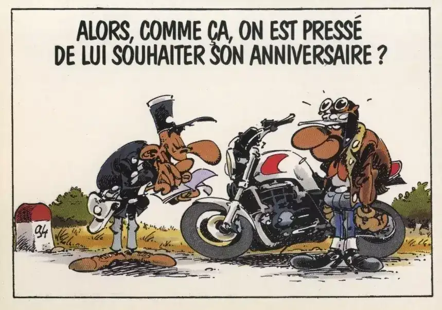 La carte postale Joe Bar Team “Alors, comme ça, on est pressé ?” capture toute la folie de l’univers moto créé par Christian Debarre, alias Fane. D’abord, elle illustre à merveille l’esprit sarcastique et complice de la bande de motards la plus barrée de la BD. Ensuite, ce visuel décalé, parfait pour un anniversaire, mélange vitesse, mauvaise foi et bonne humeur. Enfin, son format pratique permet de l’envoyer, de l’encadrer ou simplement de l’exposer dans un atelier ou un garage.