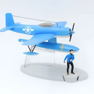 Ce hydravion bleu respecte les proportions, les lignes et la silhouette visible dans l’album. Ainsi, les flotteurs, les ailes profilées et la livrée simple mais reconnaissable sont reproduits avec précision. De plus, les détails graphiques rendent hommage à la ligne claire caractéristique d’Hergé.