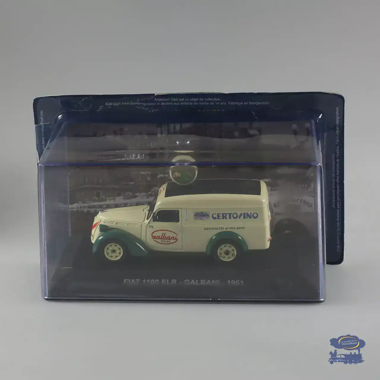 D’abord, cette camionnette miniature Fiat 1100 ELR 1951 met en avant un véhicule utilitaire emblématique. Ensuite, elle est proposée dans une version décorée aux couleurs Galbani.