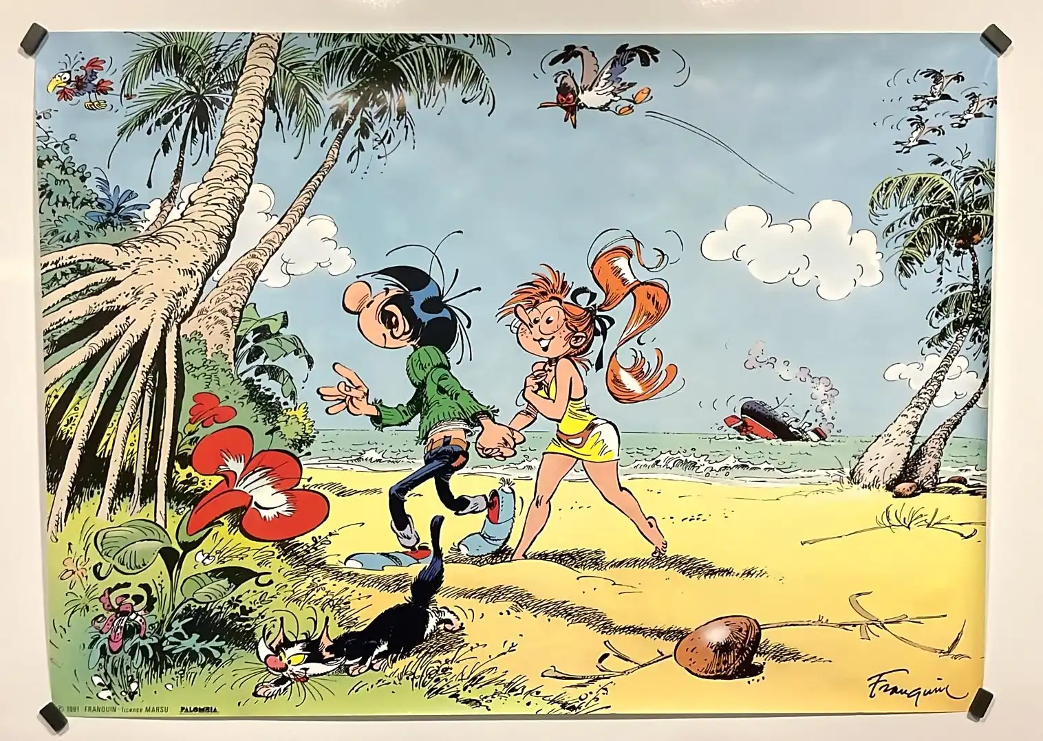 L’affiche Gaston Lagaffe met en scène Gaston et Jeanne dans une ambiance estivale sur la plage. Cette reproduction offset reprend une illustration emblématique imaginée par André Franquin. Elle s’adresse aux collectionneurs et aux passionnés de bande dessinée franco-belge.