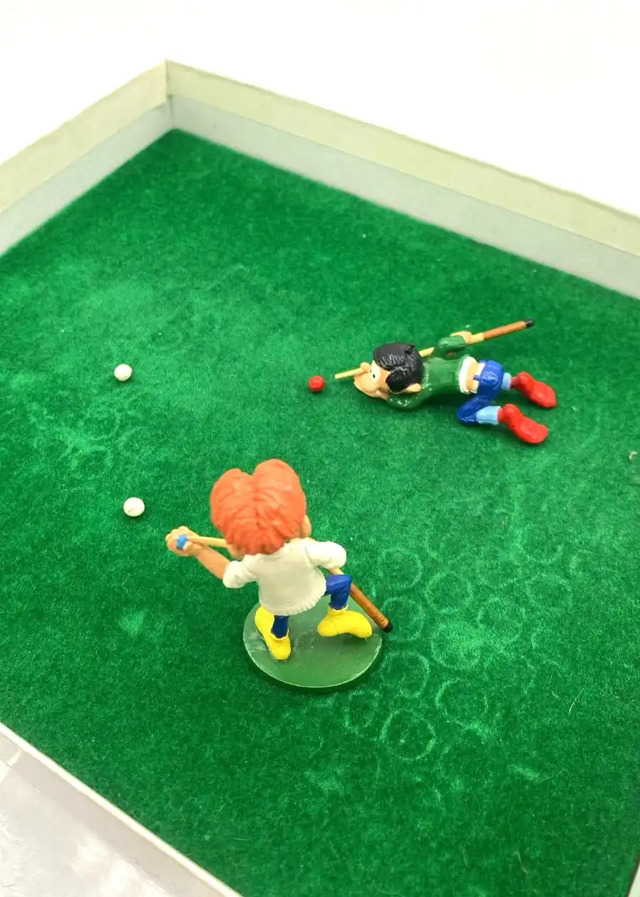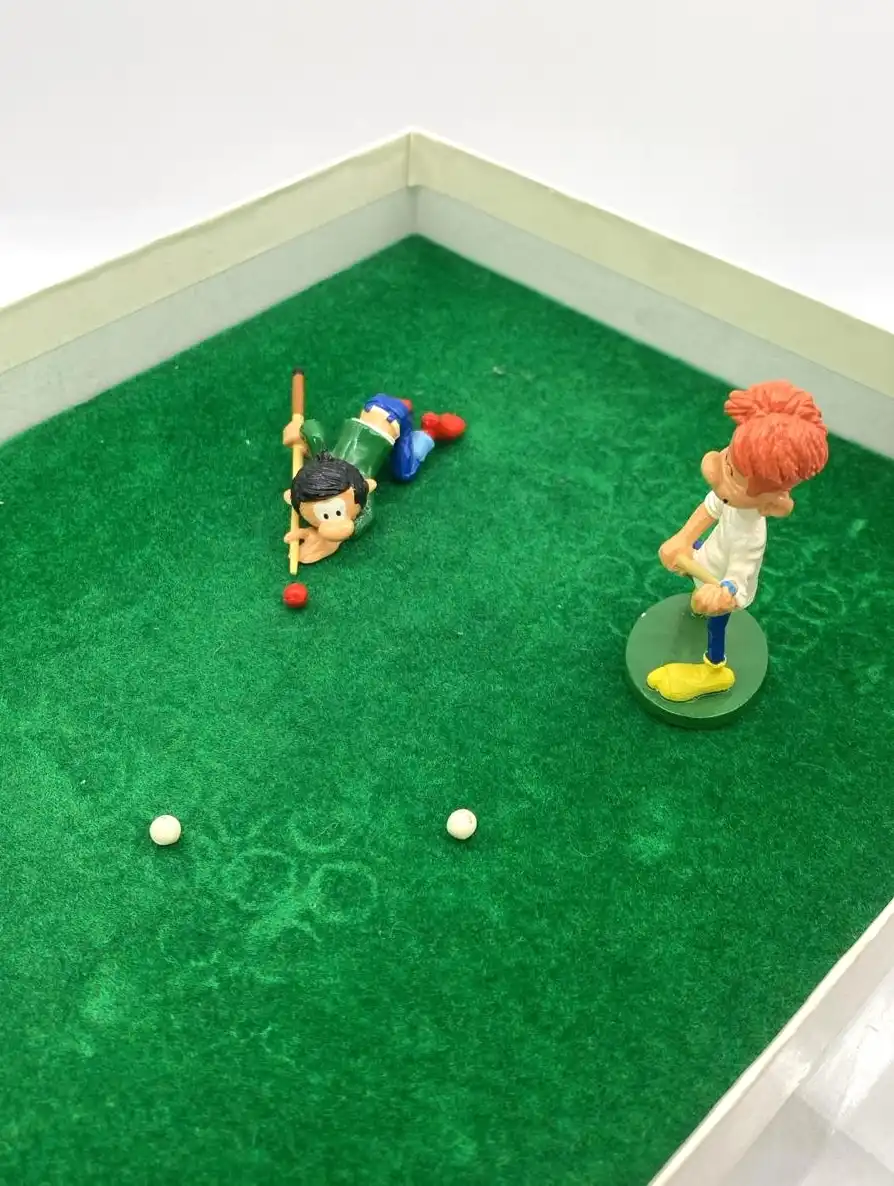 En effet, Gaston Lagaffe, c’est le génie du gag visuel, celui qui transforme n’importe quelle activité en catastrophe hilarante. Par ailleurs, quand Jules entre dans l’équation, le résultat est souvent encore plus savoureux : complicité, rivalité bon enfant, et surtout ce chaos “contrôlé” typique de Franquin. Ainsi, cette figurine Pixi 4708, intitulée “La partie de billard de Gaston et Jules” et issue de la Série n°2, capture parfaitement cet esprit.