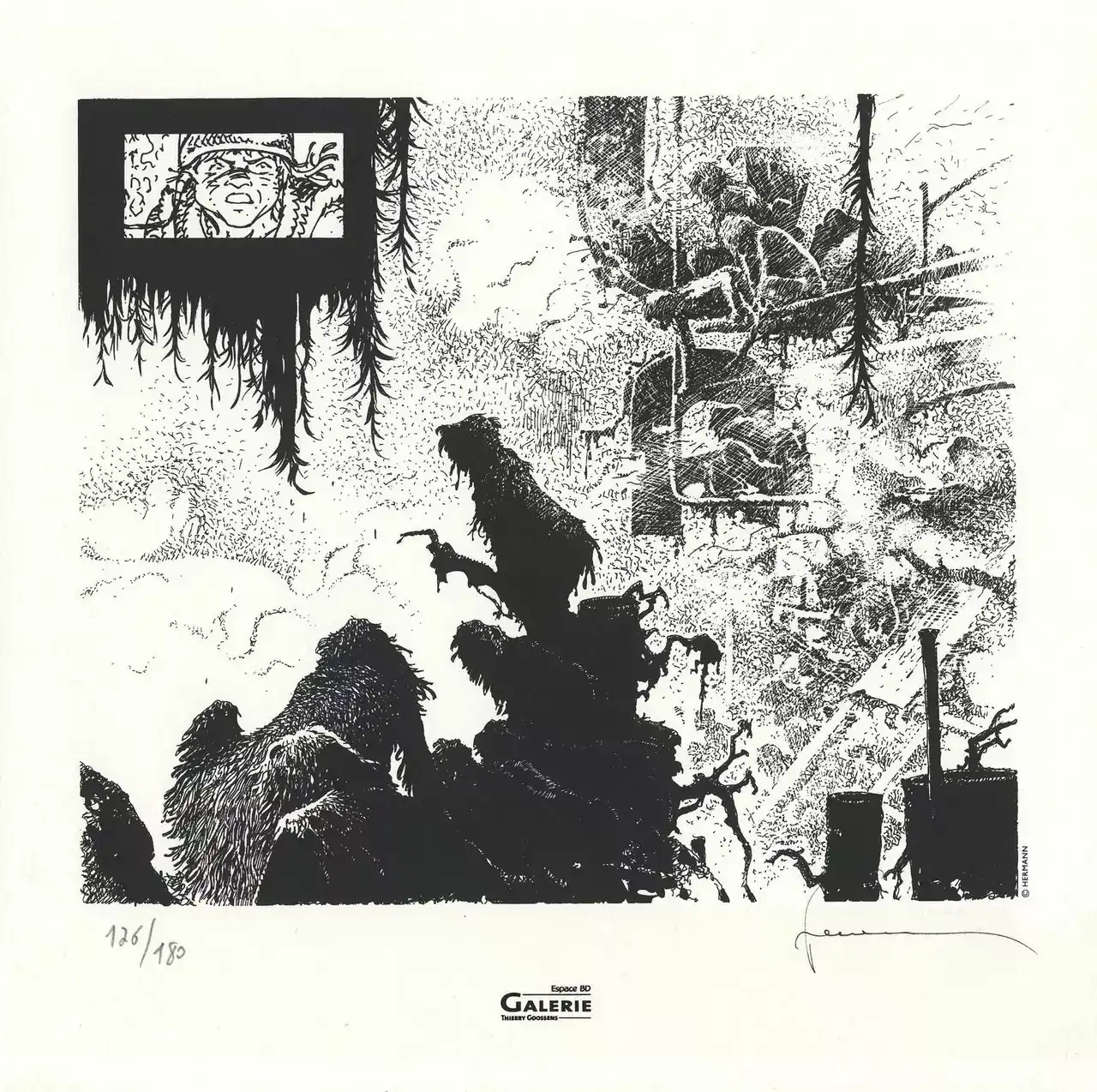 La sérigraphie Jérémiah Hermann intitulée « Dans le brouillard » attire immédiatement les amateurs de bande dessinée. En effet, Hermann est un auteur majeur du neuvième art. Il est notamment reconnu pour la série Jérémiah. Ainsi, cette œuvre met en avant son style graphique puissant et expressif.