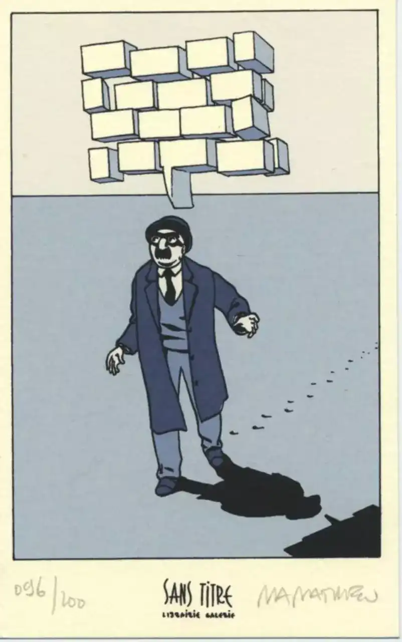 D’abord, cet ex-libris Marc-Antoine Mathieu intitulé Le dessin – Homme marchant se présente sous la forme d’une sérigraphie signée par l’auteur.