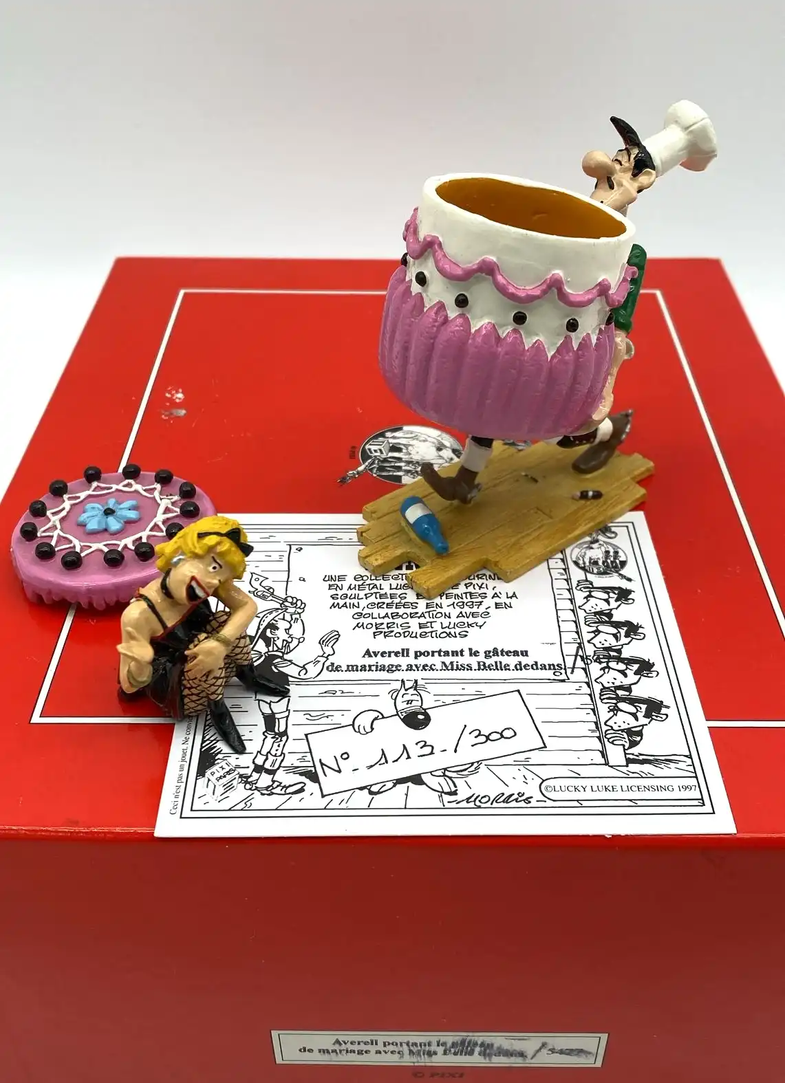 En effet, certaines figurines Pixi sont de véritables scènes de BD figées dans la matière, avec ce sens du détail qui fait toute la différence. Par ailleurs, cette pièce Lucky Luke est exactement dans cet esprit : la figurine Pixi réf. 5477 met en scène Averell portant le gâteau de mariage avec Miss Belle dedans, une situation aussi improbable que mémorable. Ainsi, cette création est une pièce idéale pour les collectionneurs exigeants et les fans de l’univers Lucky Luke.