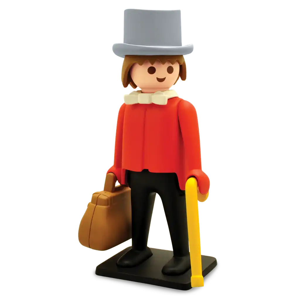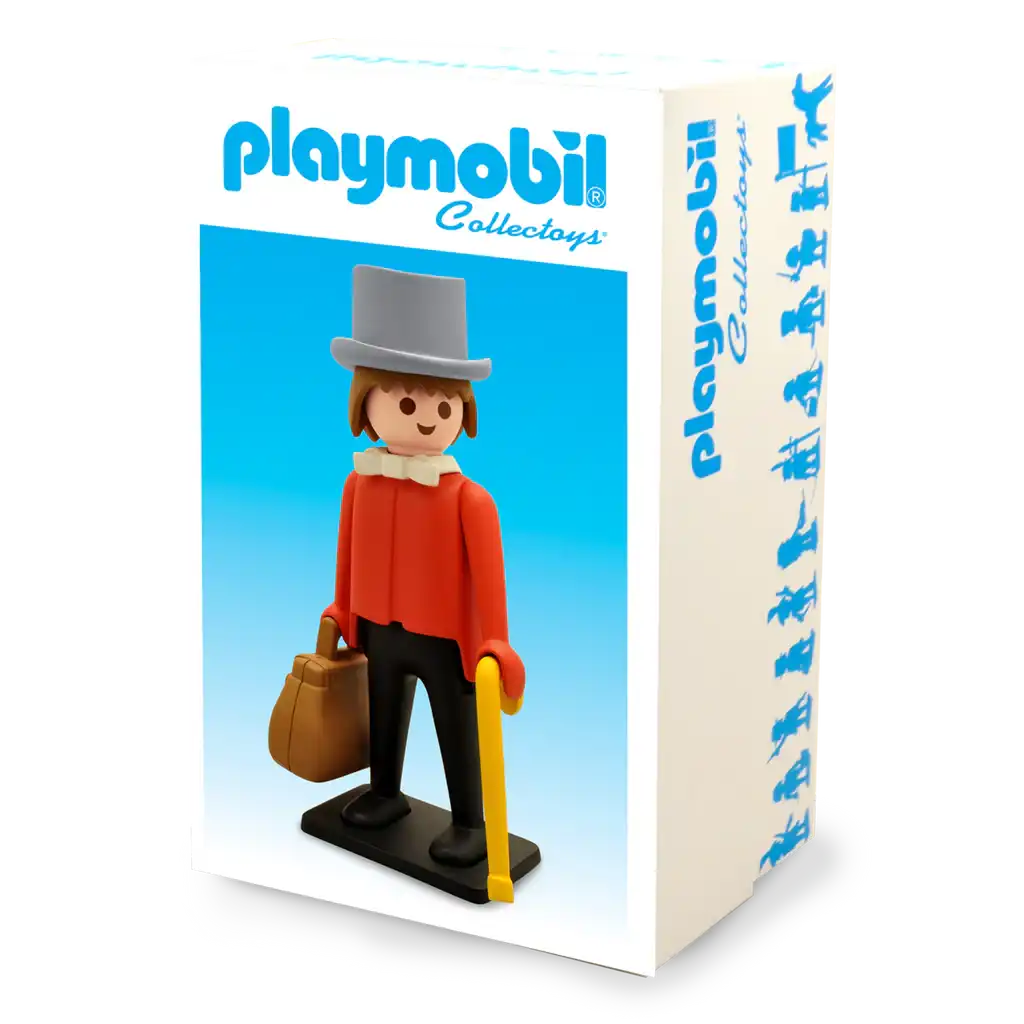 Ensuite, cette figurine Playmobil Plastoy reprend le style graphique simple et immédiatement reconnaissable des personnages Playmobil. En effet, la tenue du gentleman et les éléments inspirés du Far West rappellent les nombreux thèmes western développés dans l’univers Playmobil.