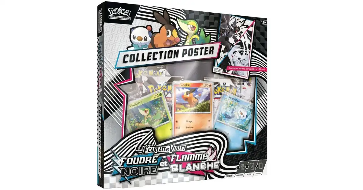 Tout d’abord, le Coffret Poster Pokémon EV10.5 Foudre Noire & Flamme Blanche permet d’enrichir votre collection du JCC Pokémon. Ainsi, ce coffret combine des boosters issus de l’extension EV10.5. De plus, il inclut un poster exclusif inspiré de l’univers Foudre Noire & Flamme Blanche.