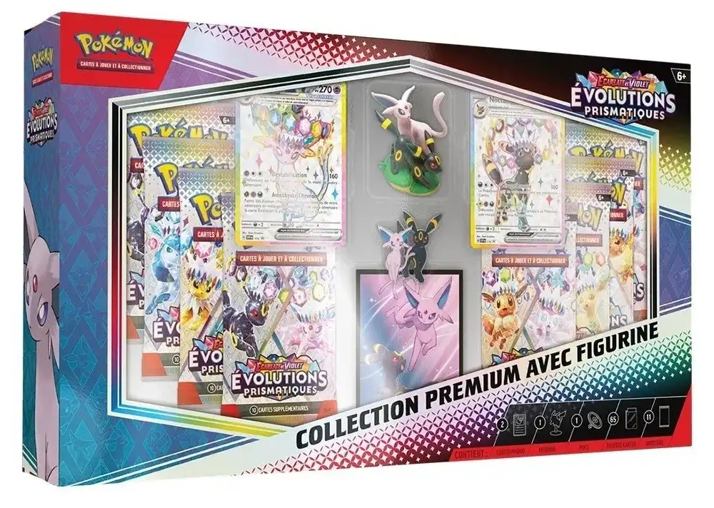 Tout d’abord, le Coffret Premium Pokémon EV8.5 Évolutions Prismatiques permet d’enrichir votre collection du JCC Pokémon. Ainsi, ce coffret réunit des boosters issus de l’extension Évolutions Prismatiques. De plus, il inclut une figurine exclusive conçue pour accompagner l’univers de cette série.