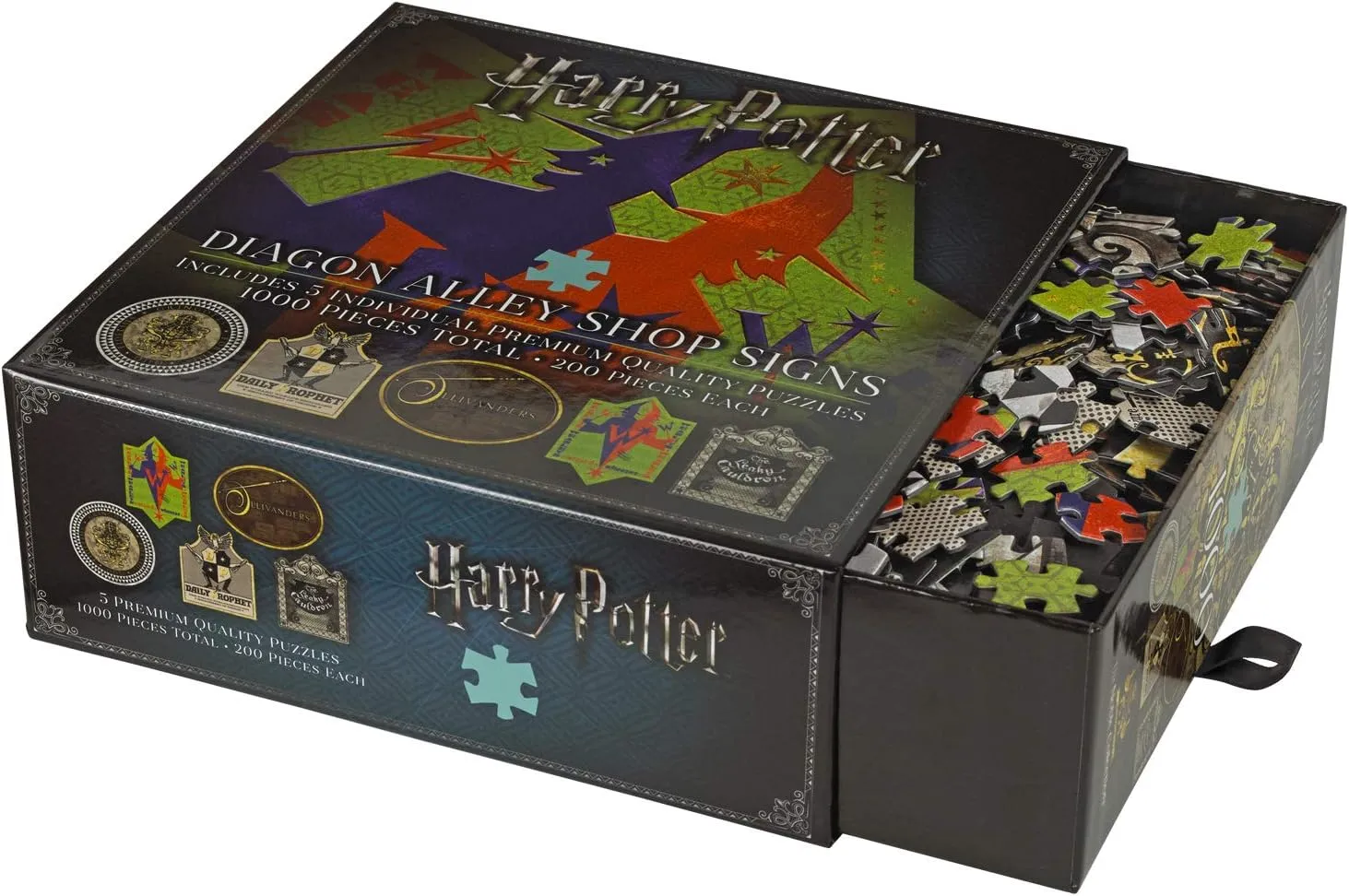 Assemble les 5 Puzzle Harry Potter The Noble Collection Diagon Alley Shop Signs, une reproduction magique des enseignes du Chemin de Traverse.