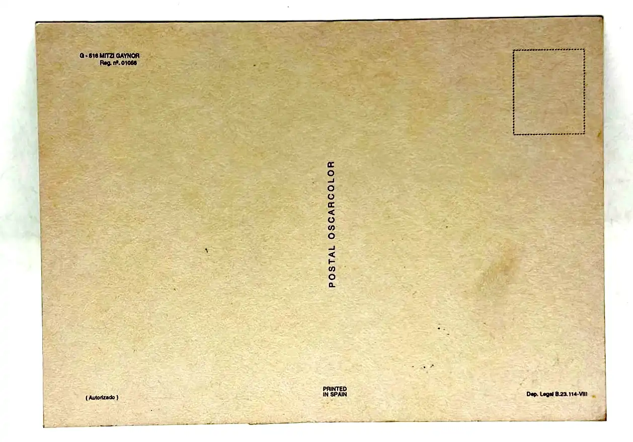 Mitzi Gaynor, actrice et chanteuse américaine, incarne le glamour hollywoodien des années 1950 et 1960. Sa présence sur cette carte postale renforce le caractère promotionnel et iconique du visuel. L’association d’une star hollywoodienne et d’un robot emblématique donne à cette pièce un intérêt particulier.