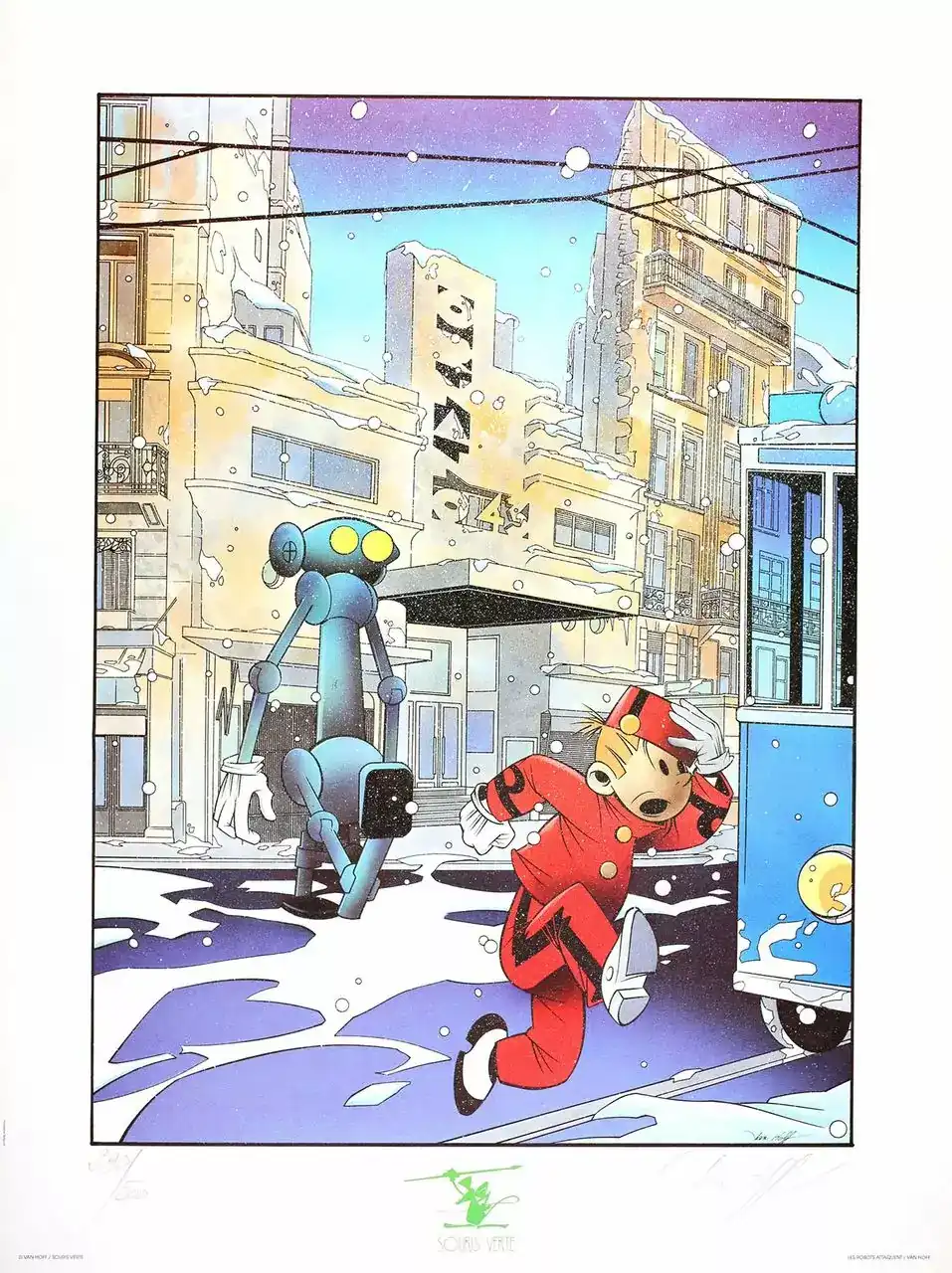 En effet, cette affiche offset porte la signature de Van Hoff. Ainsi, cette signature ajoute un intérêt particulier pour les amateurs et les collectionneurs d’illustrations liées à l’univers de Spirou. Par ailleurs, les affiches signées constituent souvent des pièces recherchées dans le domaine des objets de collection BD.