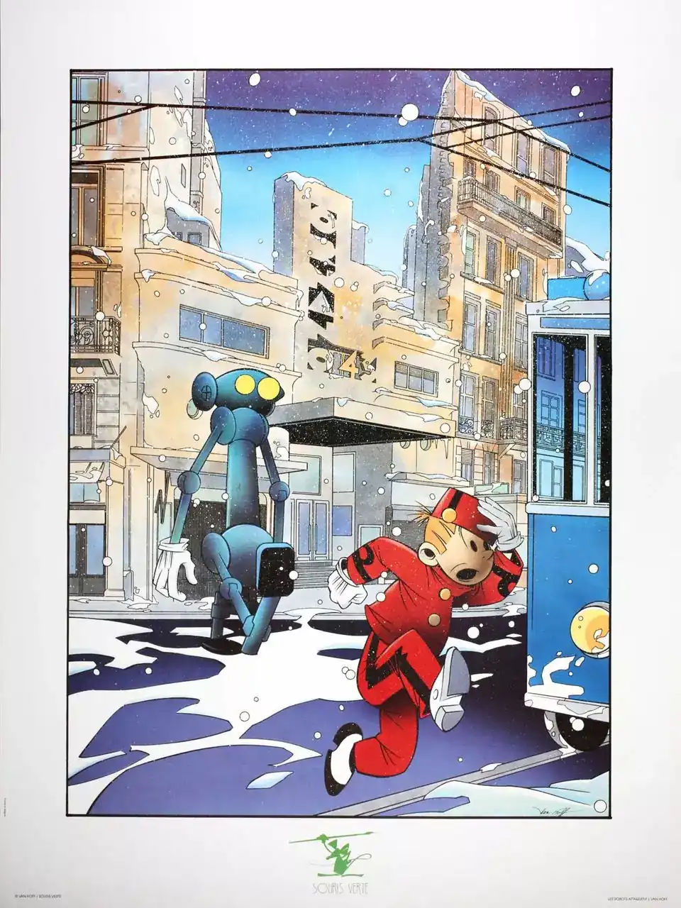 En effet, cette affiche offset est illustrée par Van Hoff. Ainsi, l’artiste propose une interprétation visuelle inspirée de l’univers de Spirou. Par ailleurs, les affiches BD constituent aujourd’hui des objets de collection appréciés par les amateurs de bande dessinée.