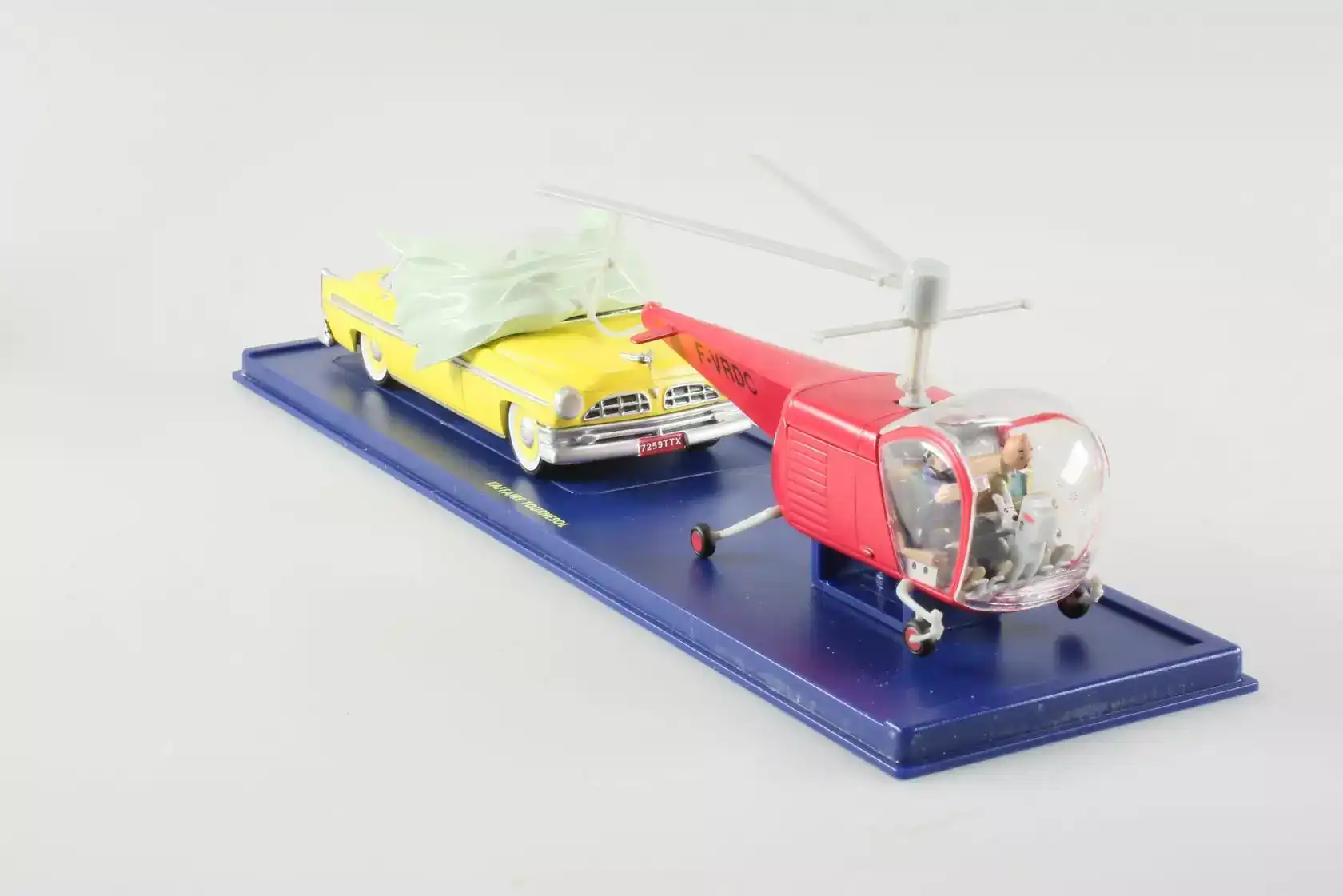 À vrai dire, ces deux véhicules incarnent deux facettes distinctes de l’album. D’un côté, l’hélicoptère symbolise la surveillance et la modernité technologique. De l’autre, la Chrysler New Yorker évoque les déplacements officiels et le pouvoir. Résultat : cet ensemble de miniatures restitue parfaitement l’atmosphère de L’Affaire Tournesol.