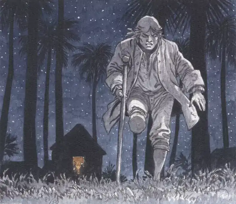 Ensuite, la thématique « L’unijambiste » met en avant un personnage marquant. Elle souligne le sens du détail et la narration visuelle de l’auteur. Ainsi, elle permet d’apprécier toute la maîtrise graphique d’Hermann.