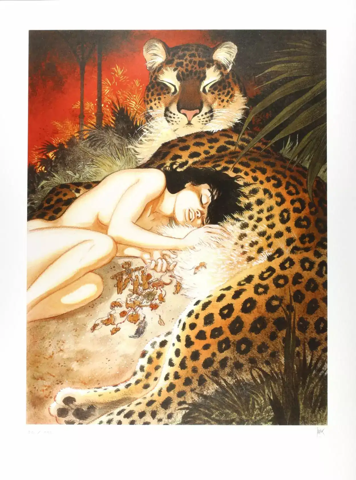 La sérigraphie Zoo Frank Pé intitulée Le Ventre de la Panthère constitue une pièce artistique remarquable inspirée de l’univers de la série Zoo. En effet, Frank Pé y exprime toute la puissance émotionnelle et la grâce animale qui caractérisent son style graphique. Grâce à une composition expressive et à un travail de nuances très maîtrisé, cette estampe capte immédiatement le regard.